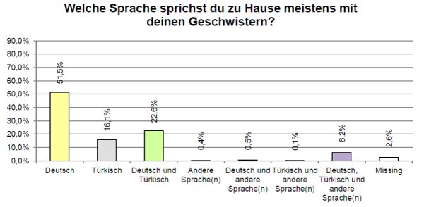 Öğrencilerin % 51,5’i yani yarısından fazlası kardeşleriyle sadece (!) Almanca konuşuyor; buna karşın Almanca ve Türkçeyi kullananların oranı % 22,6; sadece Türkçe konuşanların oranıysa % 16,1’de kalıyor.